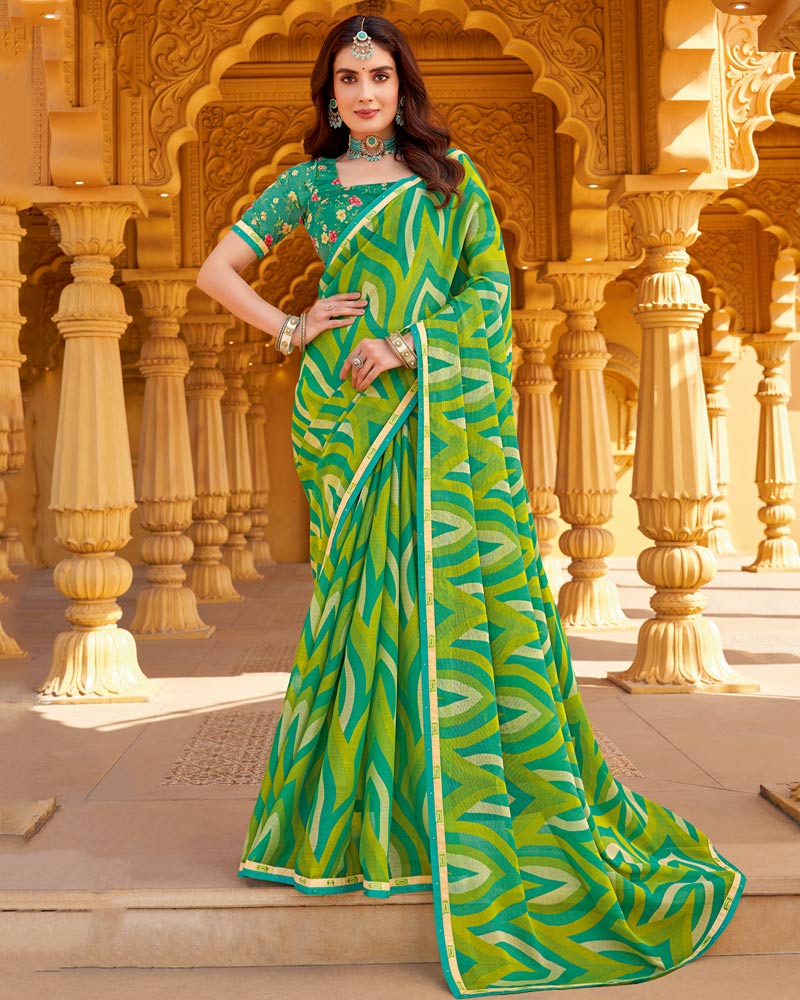 Vishal Prints Avocado Green Printed Chiffon Saree With Fancy Border