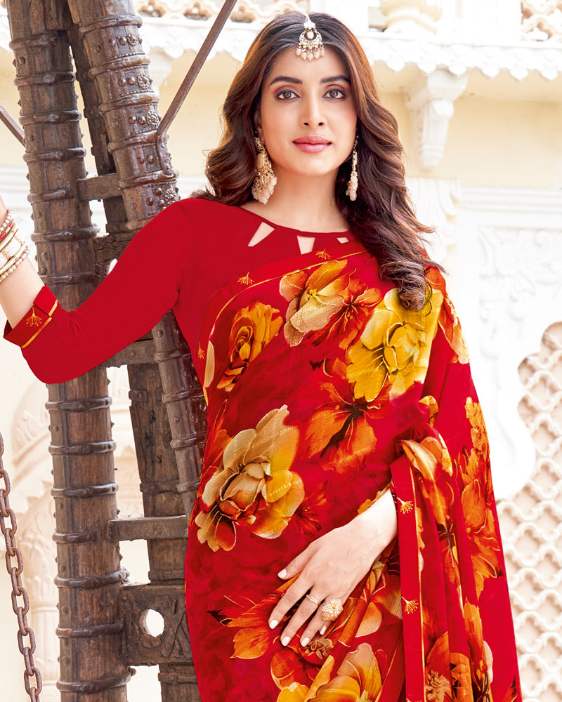 Vishal Prints Chili Red Printed Patterned Georgette Saree With Fancy Border