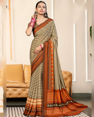 Vishal Prints Dark Beige And Flame Orange Criva Crepe Digital Print Saree