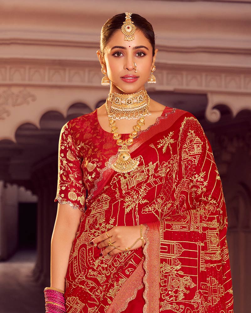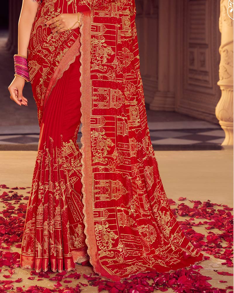 Vishal Prints Dark Red Designer Moss Viscose Saree With Zari-Embroidery-Diamond Work And Cut Work Border