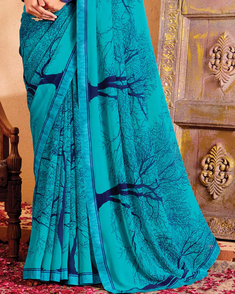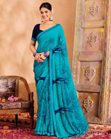 Vishal Prints Dark Turquoise Blue Printed Georgette Saree With Fancy Border