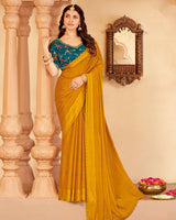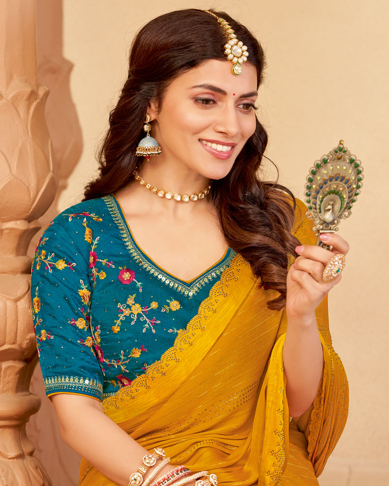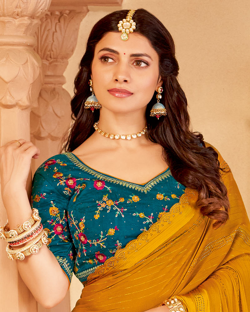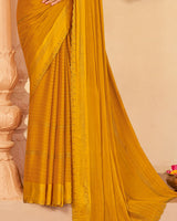 Vishal Prints Mustard Yellow Designer Fancy Chiffon Saree With Diamond Work And Weaved Satin Patta Cut Work Border