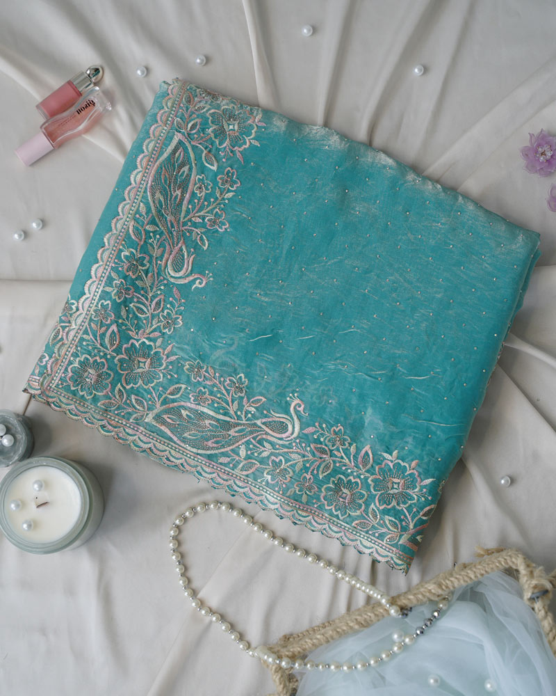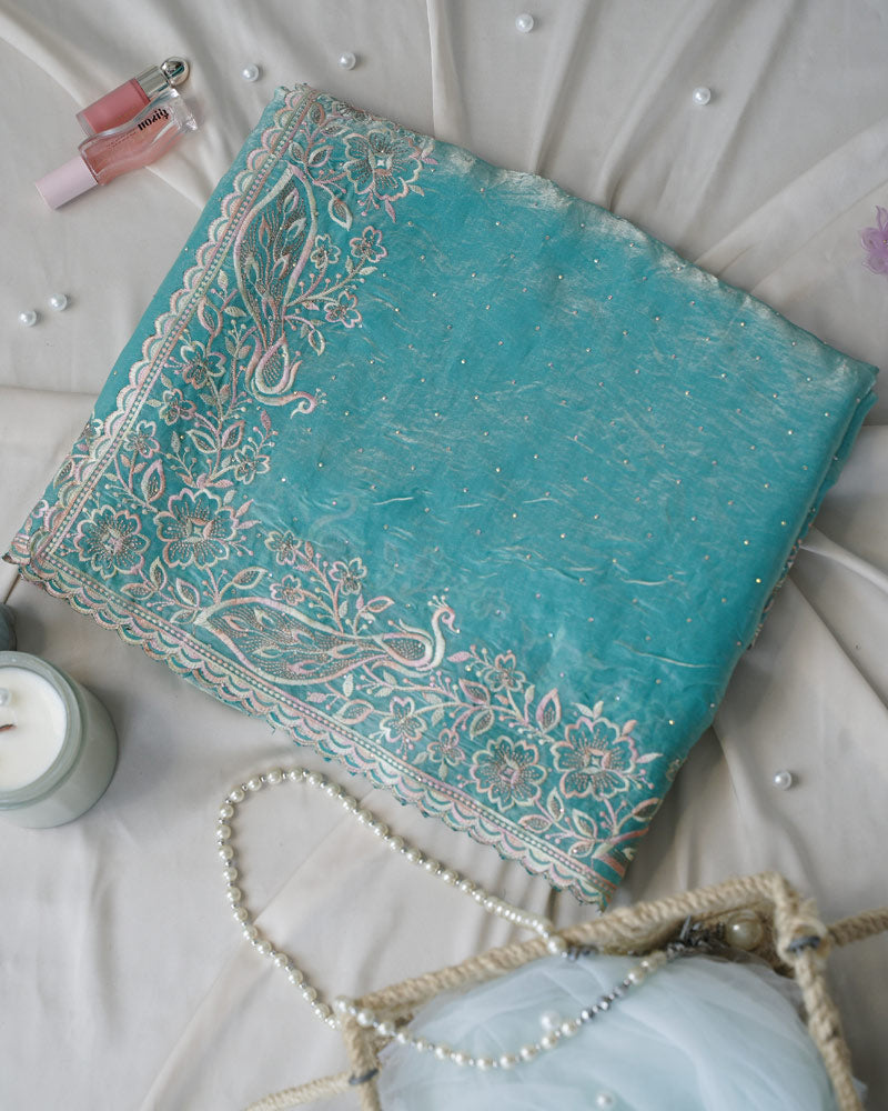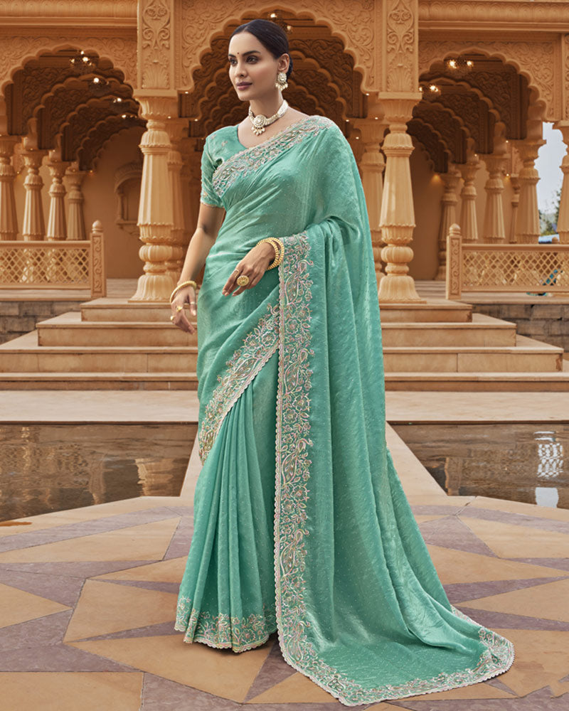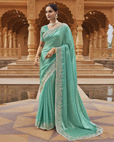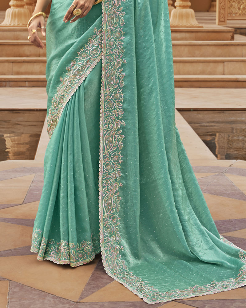 Vishal Prints Ocean Blue Designer Fancy Satin Saree With Embroidery-Diamond Work And Cut Work Border