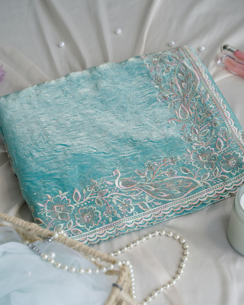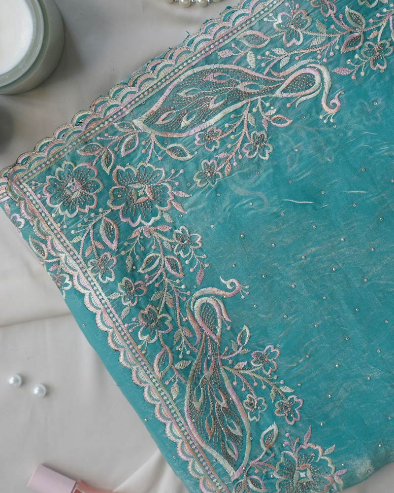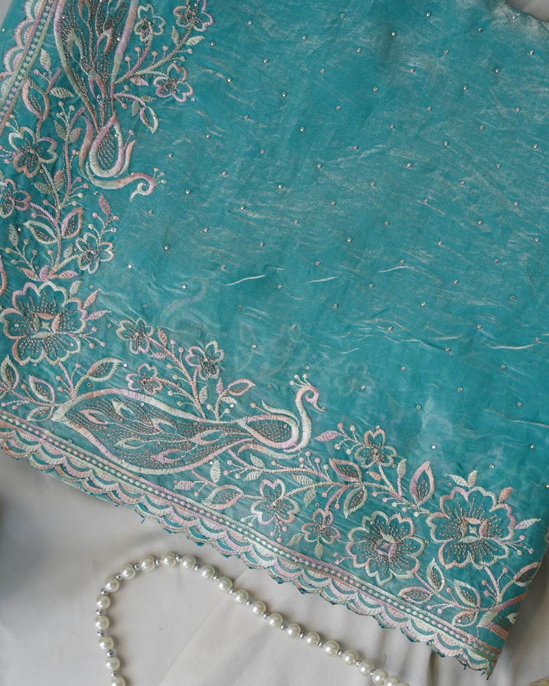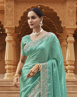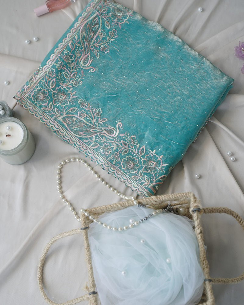 Vishal Prints Ocean Blue Designer Fancy Satin Saree With Embroidery-Diamond Work And Cut Work Border