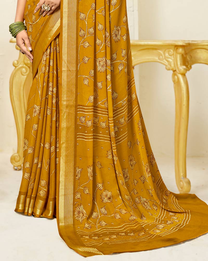 Vishal Prints Ochre Printed Criva Crepe Saree With Weaved Viscose Patta