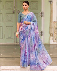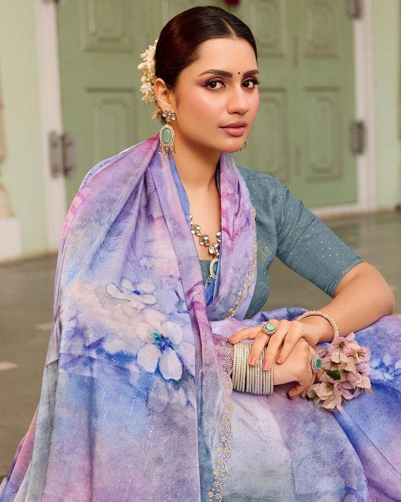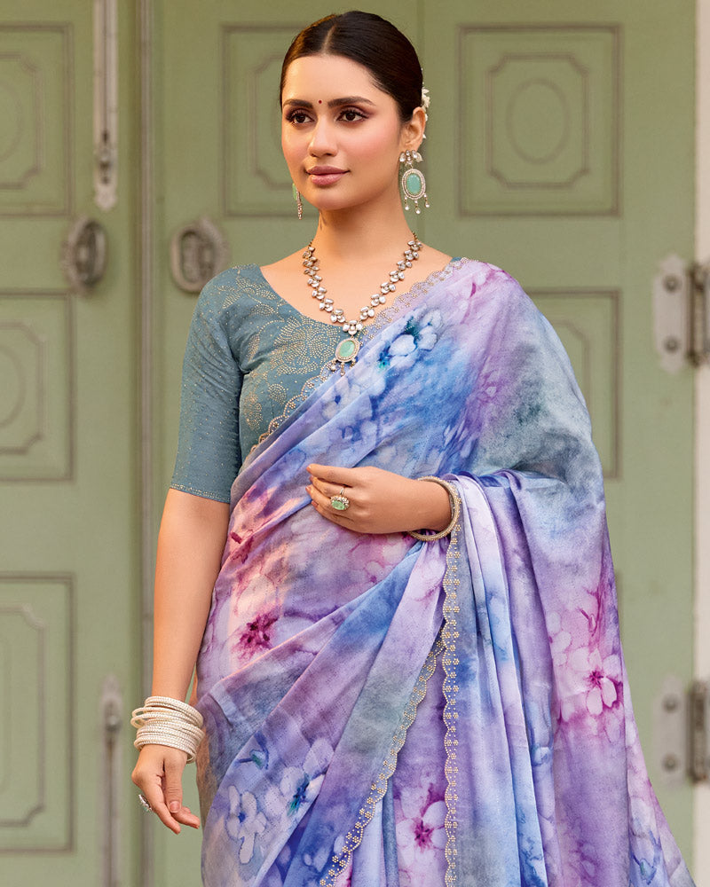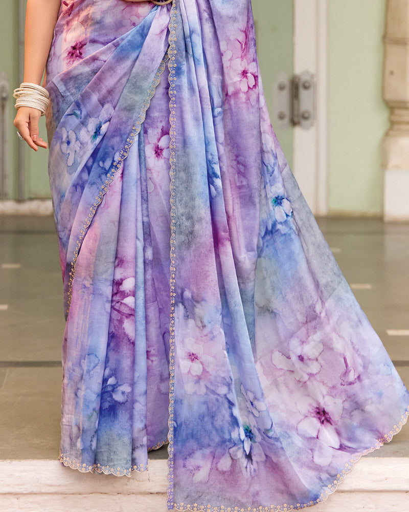 Vishal Prints Pastel Purple Designer Organza Digital Print Saree With Diamond Work And Cut Work Border