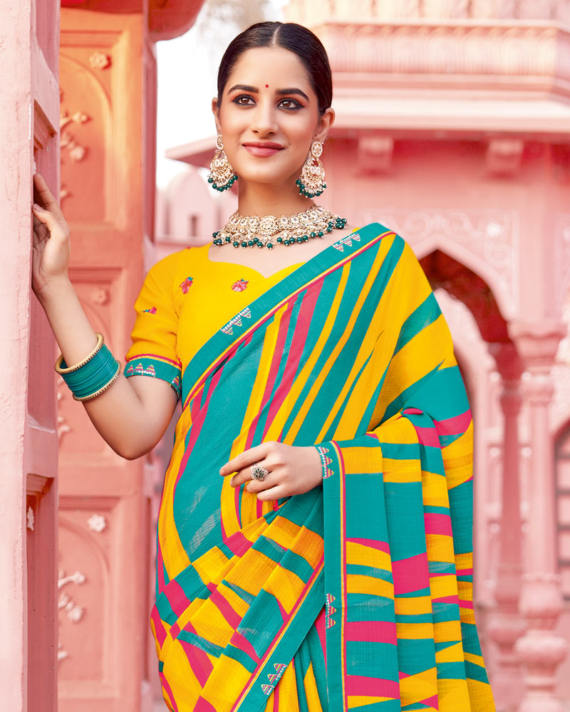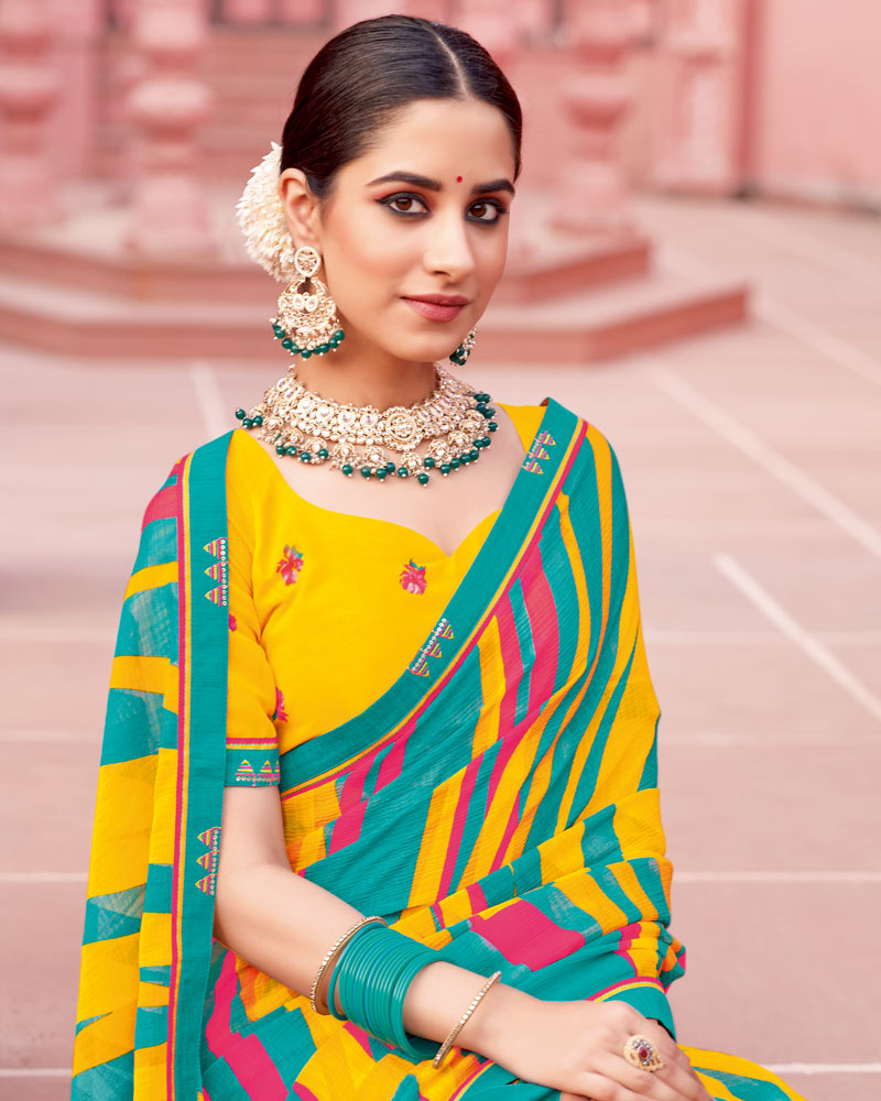 Vishal Prints Persian Green Printed Chiffon Saree With Fancy Border