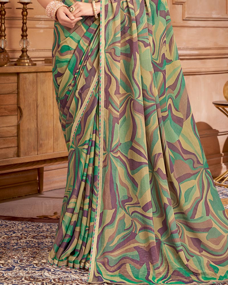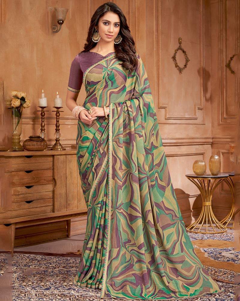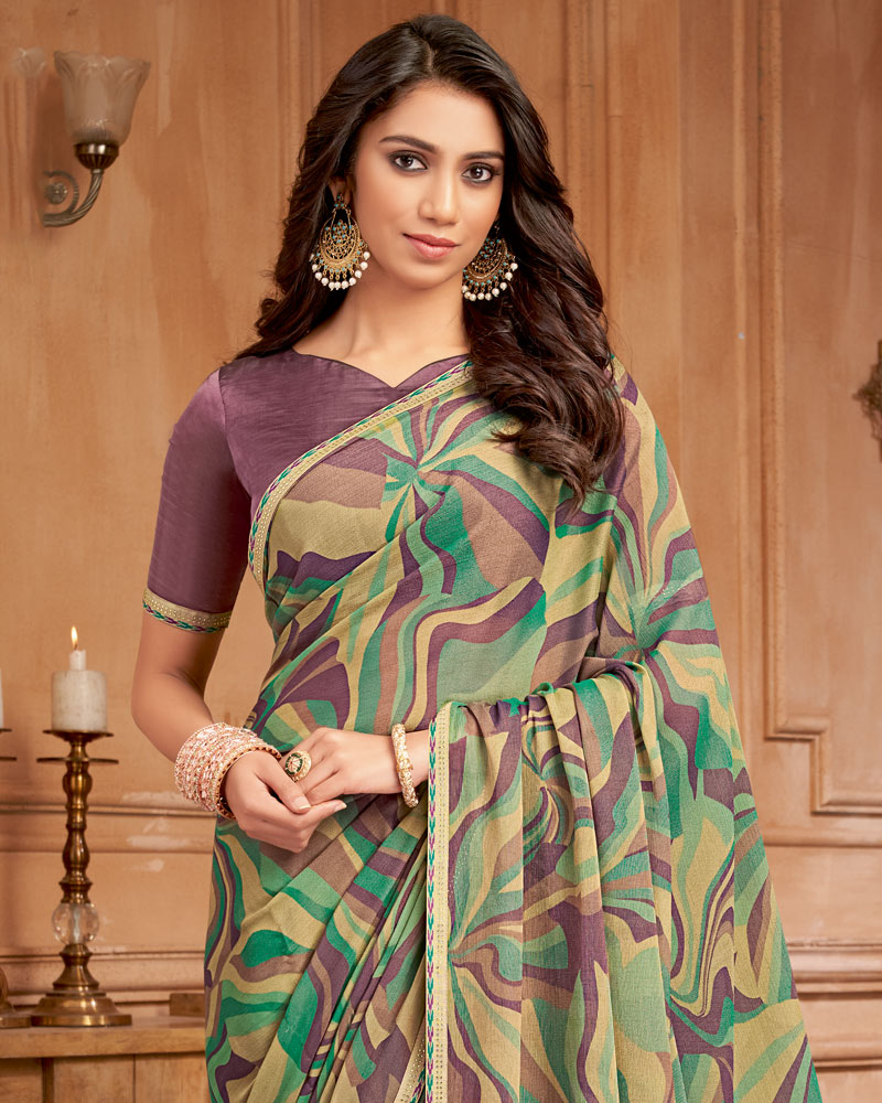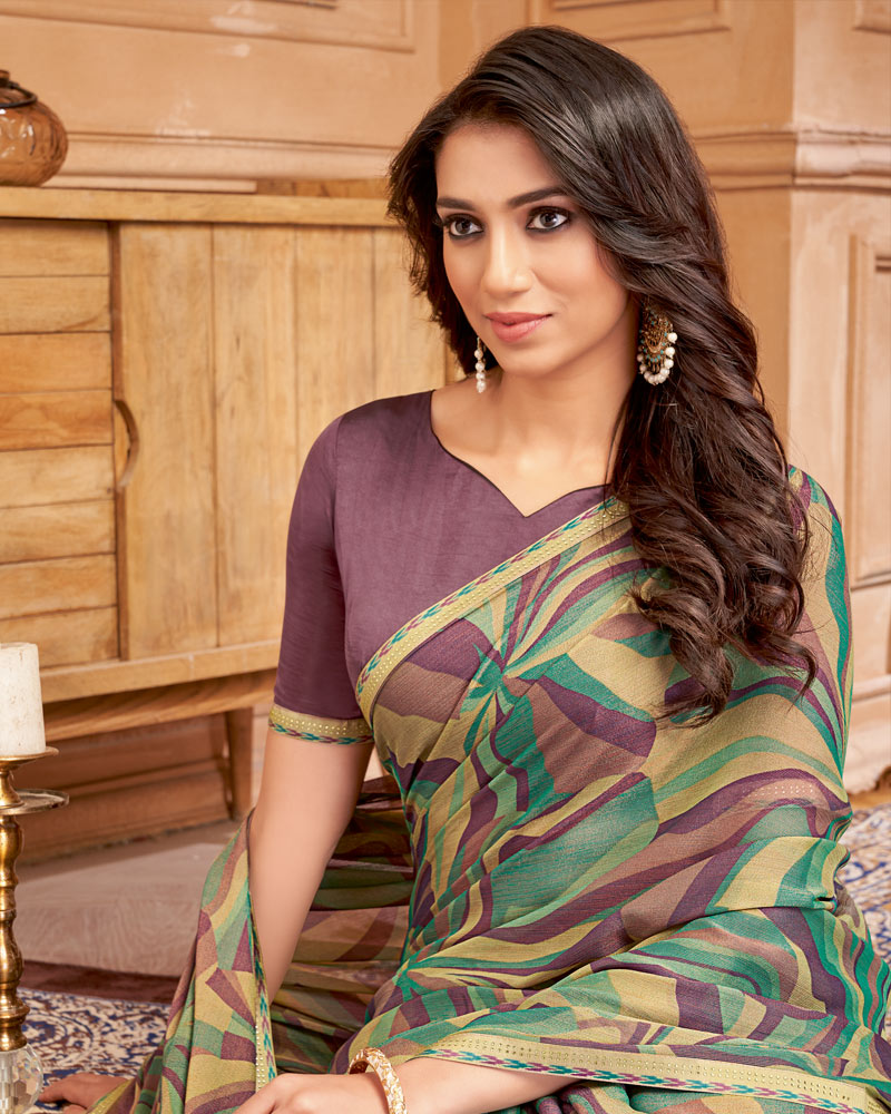 Vishal Prints Sage Green And Brownish Purple Printed Brasso Saree With Fancy Border