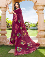 Vishal Prints Wine Digital Print Chiffon Saree With Stone Work And Satin Border