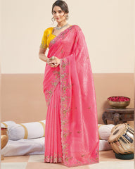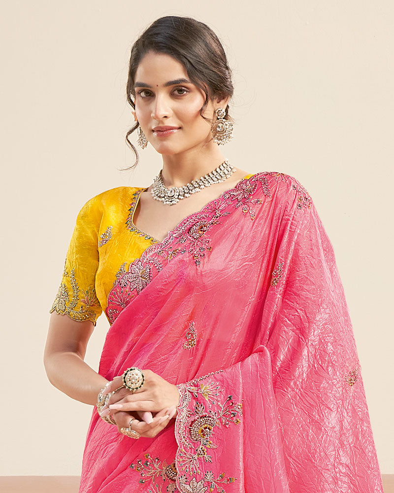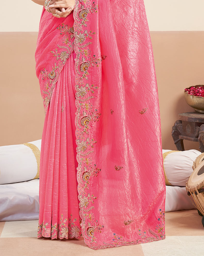 Warm Pink Designer Gold Crush Saree With Embroidery-Diamond Work And Cut Work Border