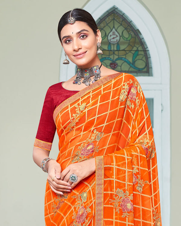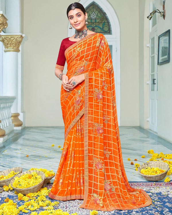 Vishal Prints Dark Orange Printed Georgette Saree With Foil Print And Zari Border