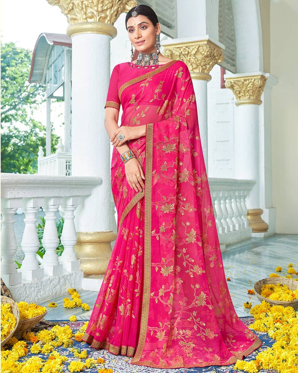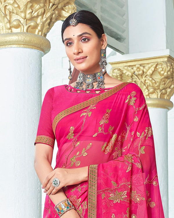 Vishal Prints Raspberry Pink Printed Georgette Saree With Foil Print And Zari Border
