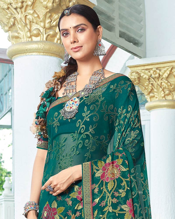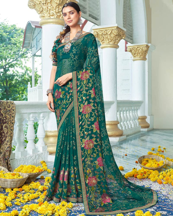Vishal Prints Forest Green Printed Georgette Saree With Foil Print And Zari Border
