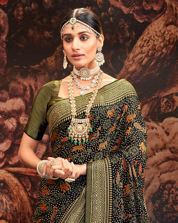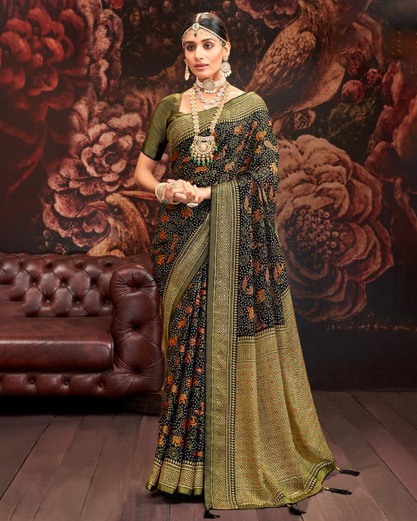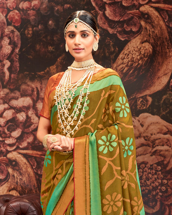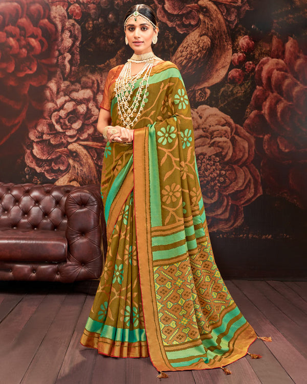Vishal Prints Khaki Green Printed Silk Brasso Saree With Zari Border
