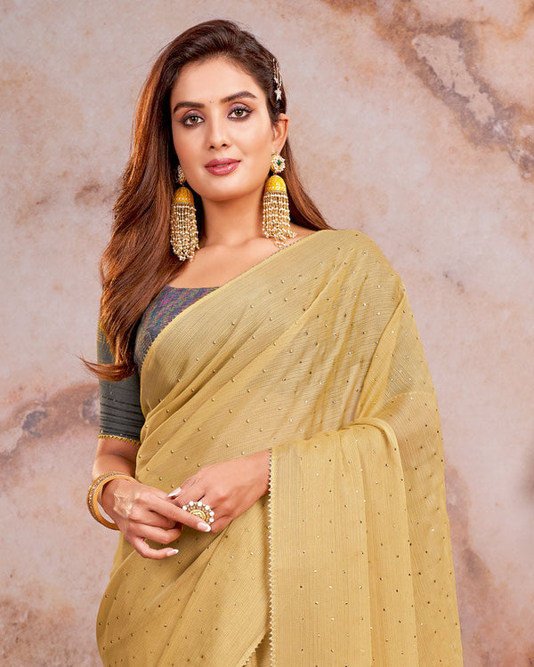 Vishal Prints Cream Printed Chiffon Saree With Foil Print-Diamond Work And Gota Patti Border
