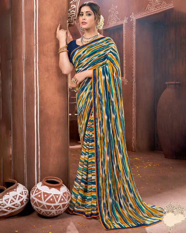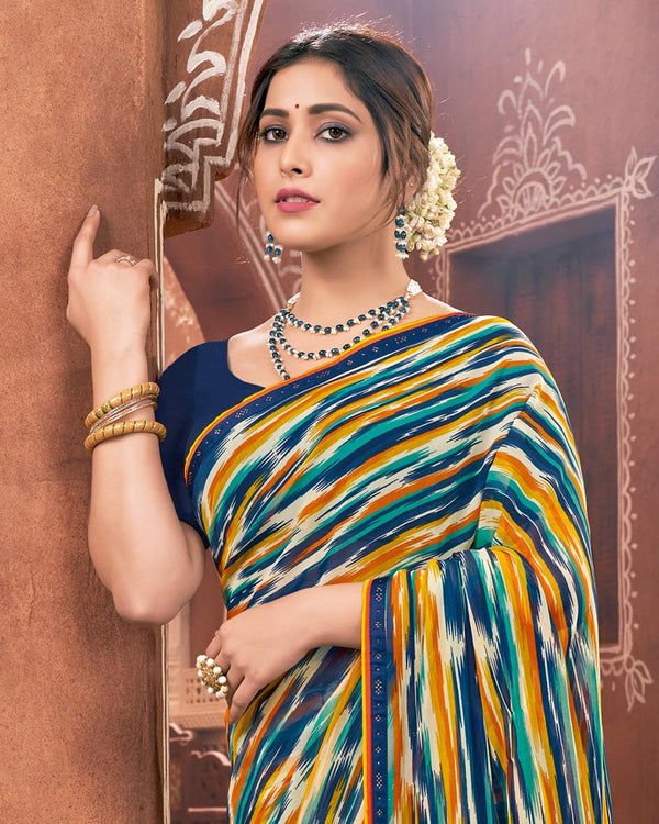 Vishal Prints Prussian Blue Printed Chiffon Saree With Foil Print And Zari Border