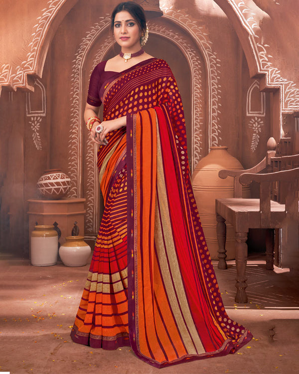 Vishal Prints Red Printed Chiffon Saree With Foil Print And Cut Work Embroidery Border