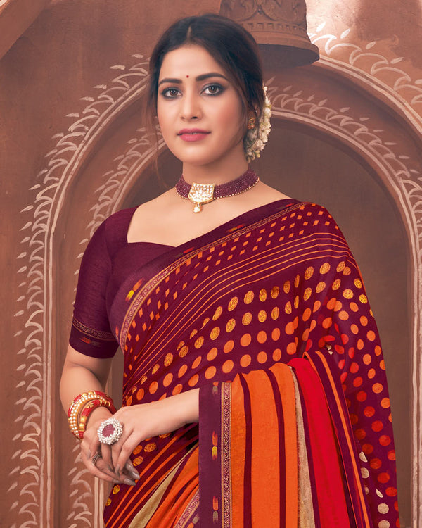 Vishal Prints Orange Red Printed Chiffon Saree With Foil Print And Cut Work Embroidery Border