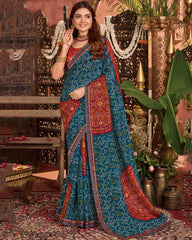 Vishal Prints Deep Teal Blue Bandhani Print Patterned Fancy Chiffon Saree With Printed Cut Work Border