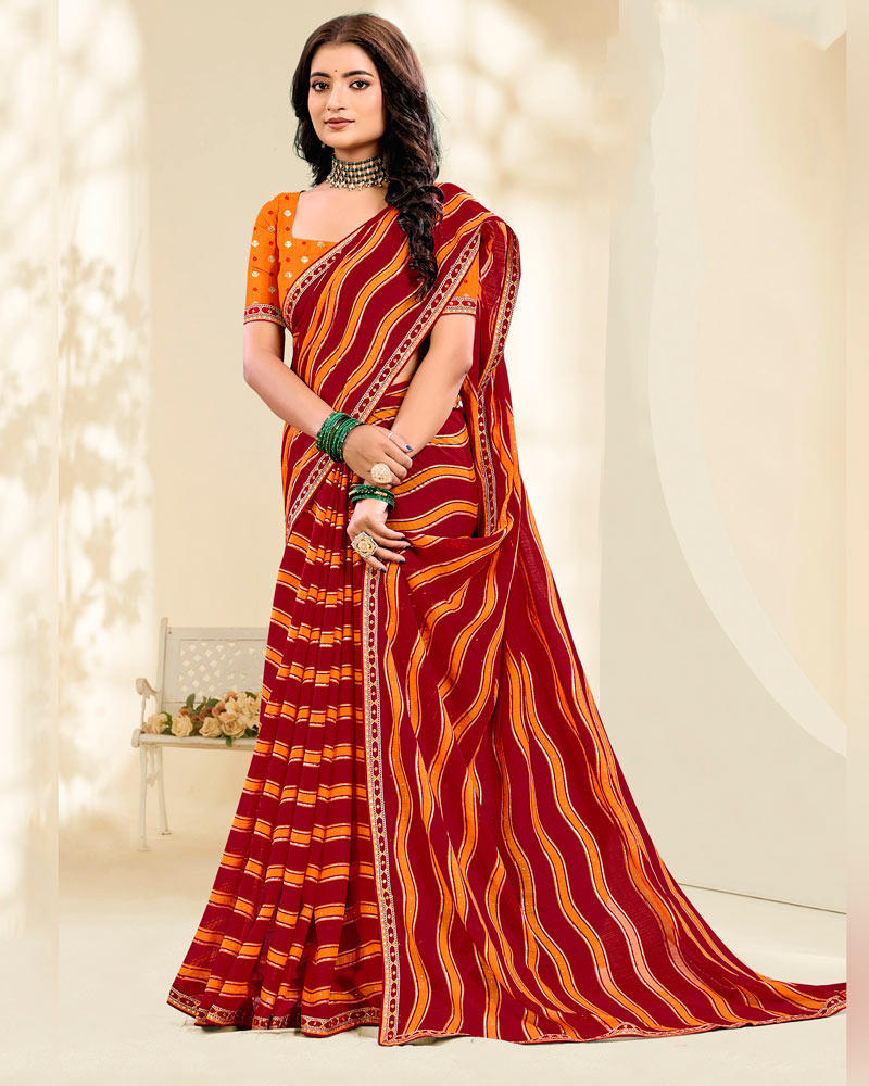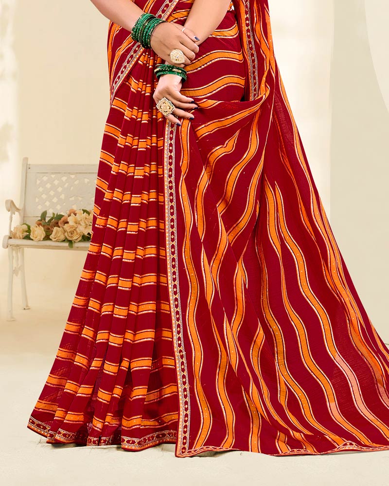 Vishal Prints Paprika Red And Dark Orange Printed Fancy Chiffon Traditional Print Saree With Foil Print And Border