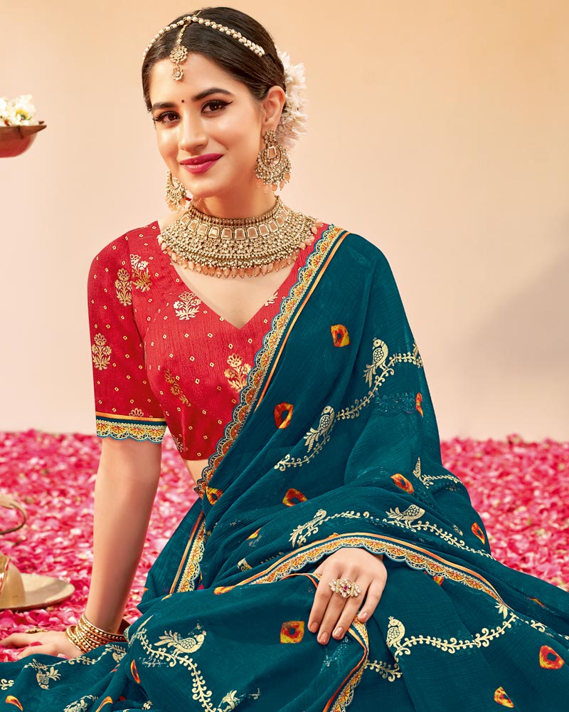 Vishal Prints Peacock Blue Printed Fancy Chiffon Traditional Print Saree With Foil Print And Cut Work Border