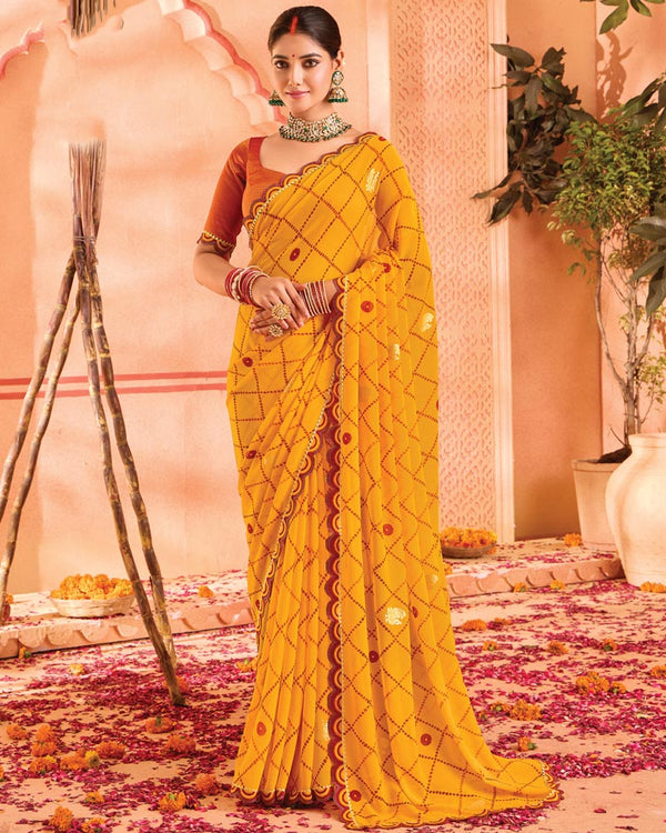 Vishal Prints Yellow Orange Fancy Chiffon Traditional Print Saree With Foil Print And Cut Work Border