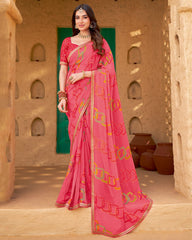 Vishal Prints Warm Pink Printed Chiffon-Brasso Saree With Zari Border