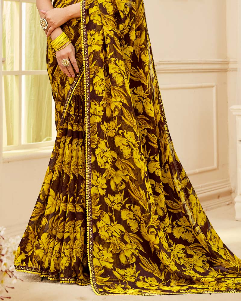 Vishal Prints Brown And Vibrant Yellow Printed Chiffon Saree With Fancy Border