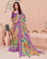 Vishal Prints Dusty Purple Printed Chiffon Saree With Weaved Satin Patta