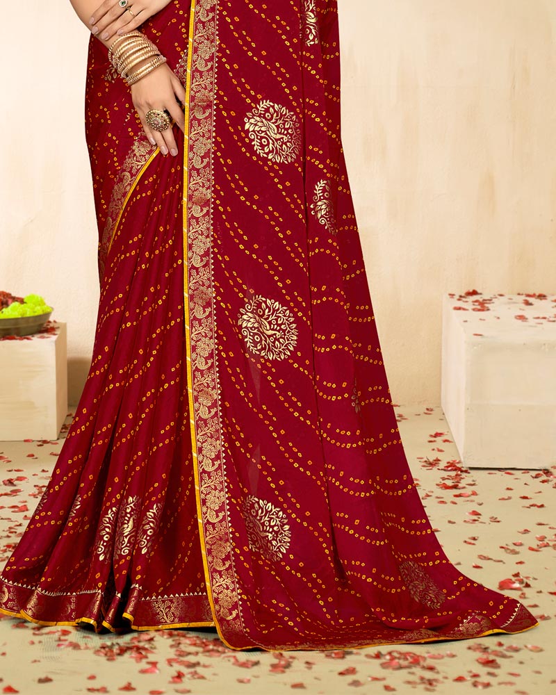 Vishal Prints Red Wine Printed Chiffon Traditional Print Saree With Foil Print And Zari Border