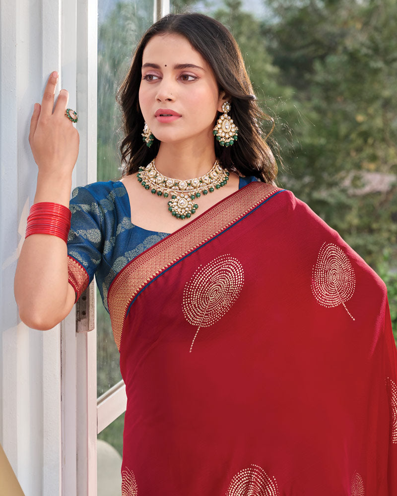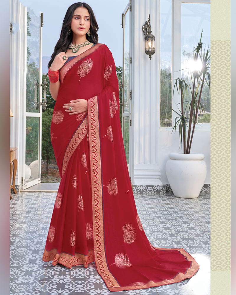 Vishal Prints Venetian Red Chiffon Saree With Foil Print And Zari Border