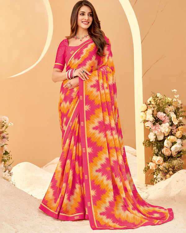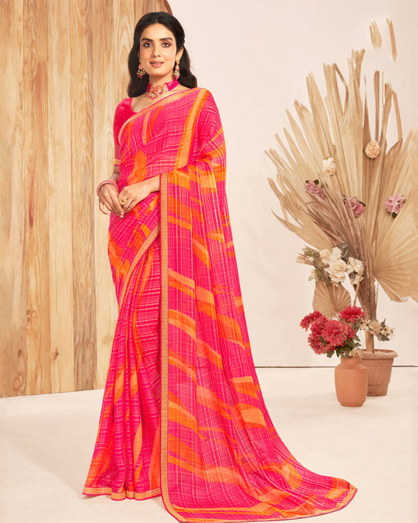 Vishal Prints Raspberry Pink Printed Chiffon-Brasso Saree With Zari Border