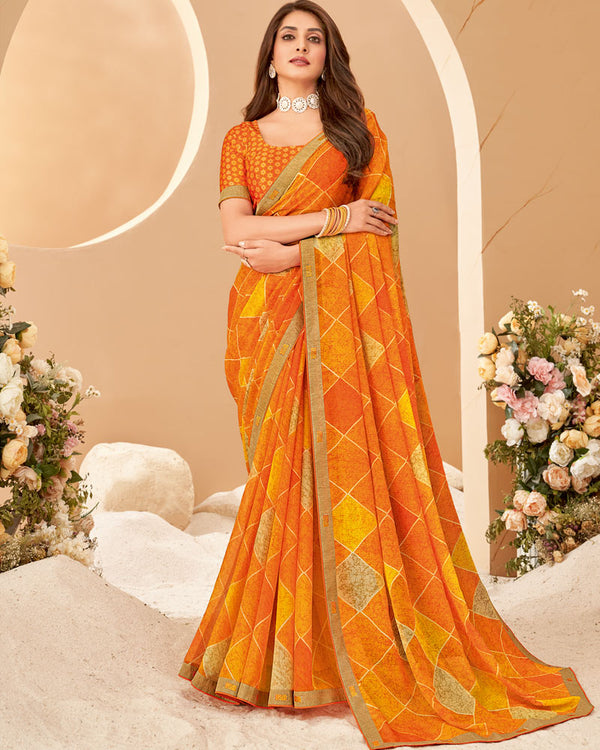Vishal Prints Flame Orange Designer Chiffon Saree With Embroidery-Diamond Work And Fancy Border