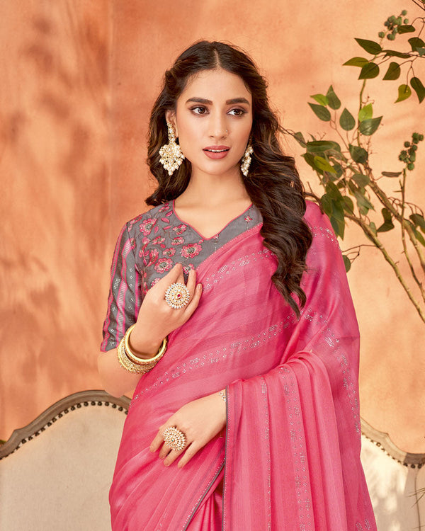 Vishal Prints Mandy Pink Printed Chiffon-Brasso Saree With Zari Border