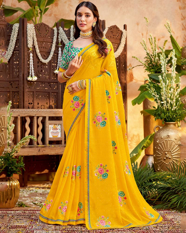 Vishal Prints Golden Yellow Designer Fancy Chiffon Saree With Embroidery-Diamond Work And Border