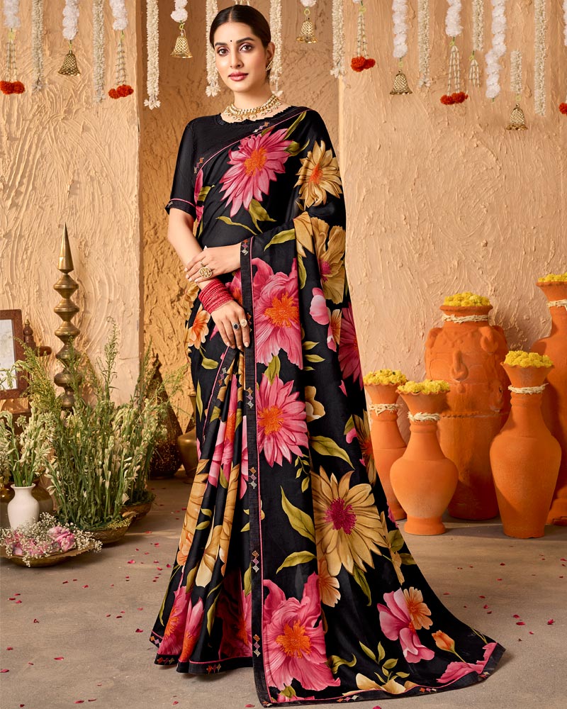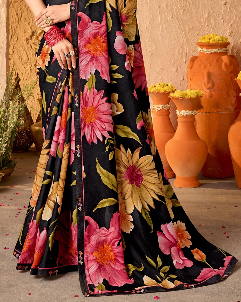 Vishal Prints Midnight Black Crepe-Georgette Digital Print Saree With Fancy Border
