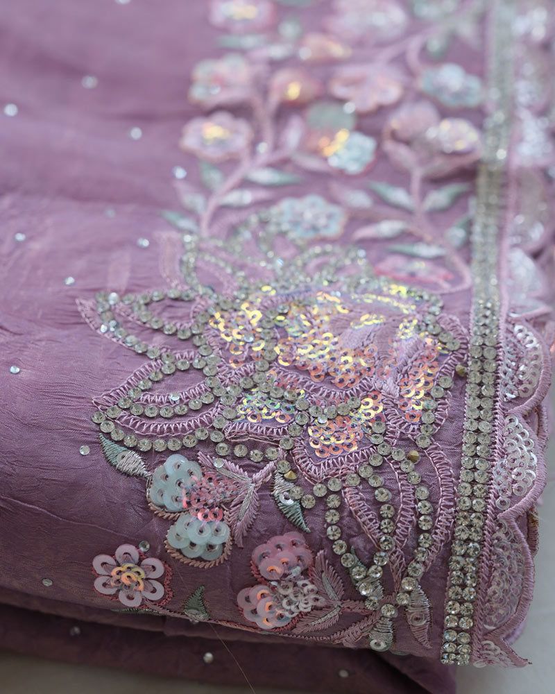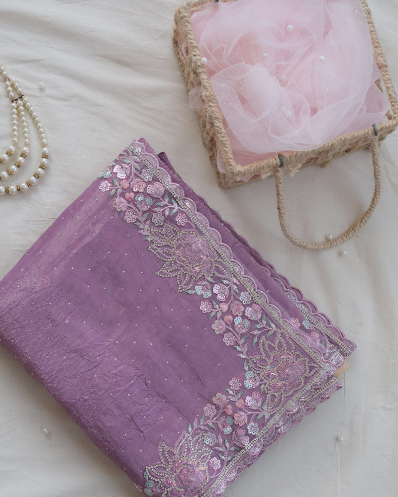Vishal Prints Dusty Purple Tissue Organza Saree With Multi Sequence Embroidery-Diamond Work And Cut Work Border