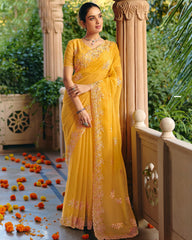 Vishal Prints Mustard Designer Fancy Chiffon Saree With Diamond Work And Cut Work Embroidery Border