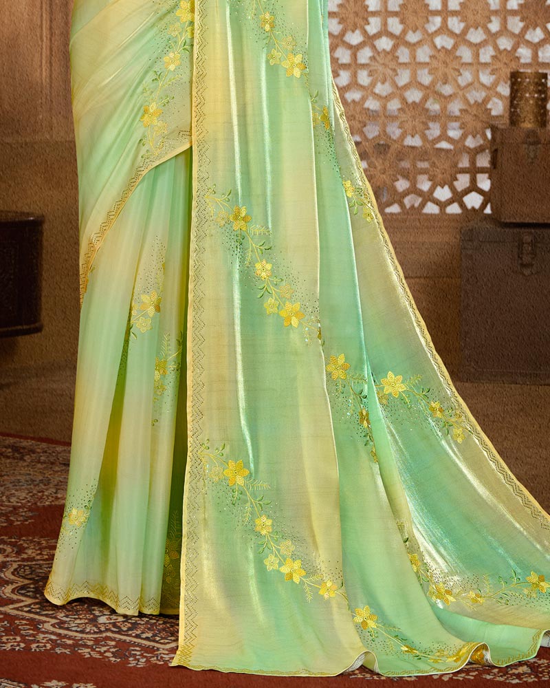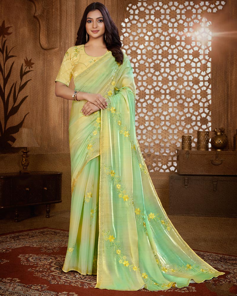 Vishal Prints Straw Yellow Designer Organza Saree With Embroidery Diamond Work And Core Piping