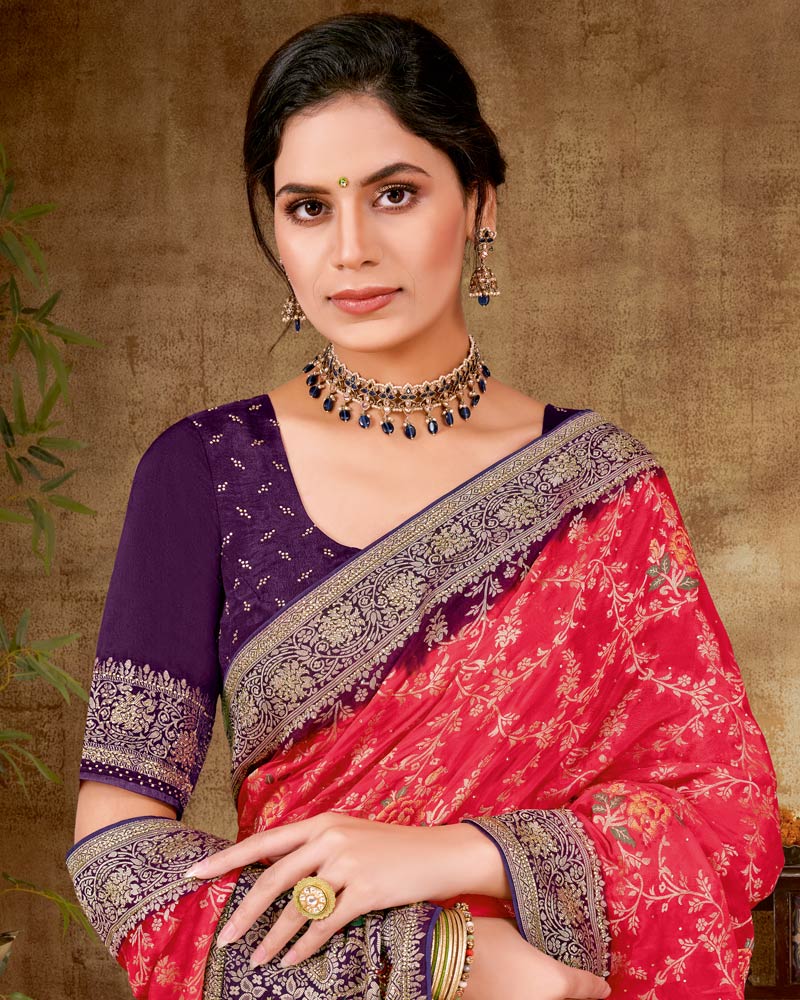 Vishal Prints Tomato Red Designer Dola Weaving Saree With Diamond Work And Weaving Border