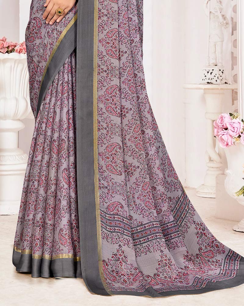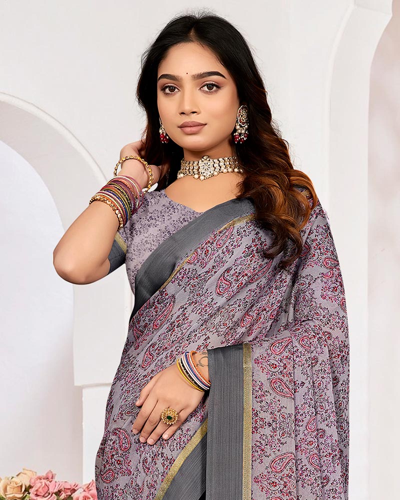 Vishal Prints Dusty Grey Purple Printed Chiffon Digital Print Saree With Weaved Satin Patta
