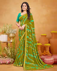 Vishal Prints Mehndi Green Printed Georgette Saree With Fancy Border