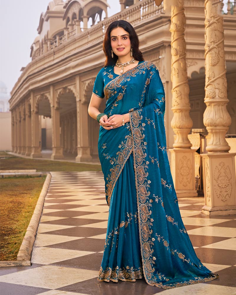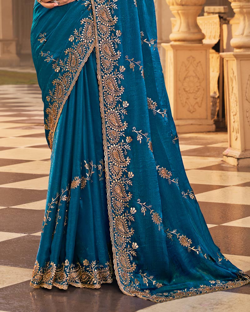 Peacock Blue Designer Fancy Chiffon Saree With Embroidery-Diamond Work And Cut Work Border