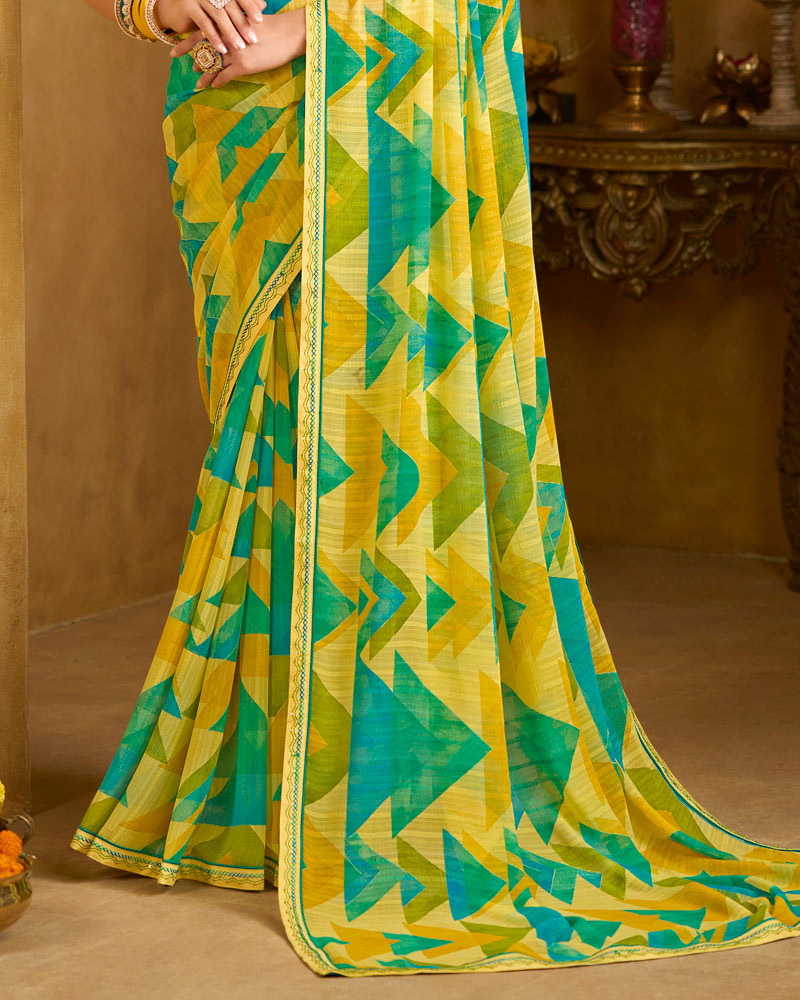 Vishal Prints Pastel Yellow And Sea Green Printed Patterened Georgette Saree With Fancy Border