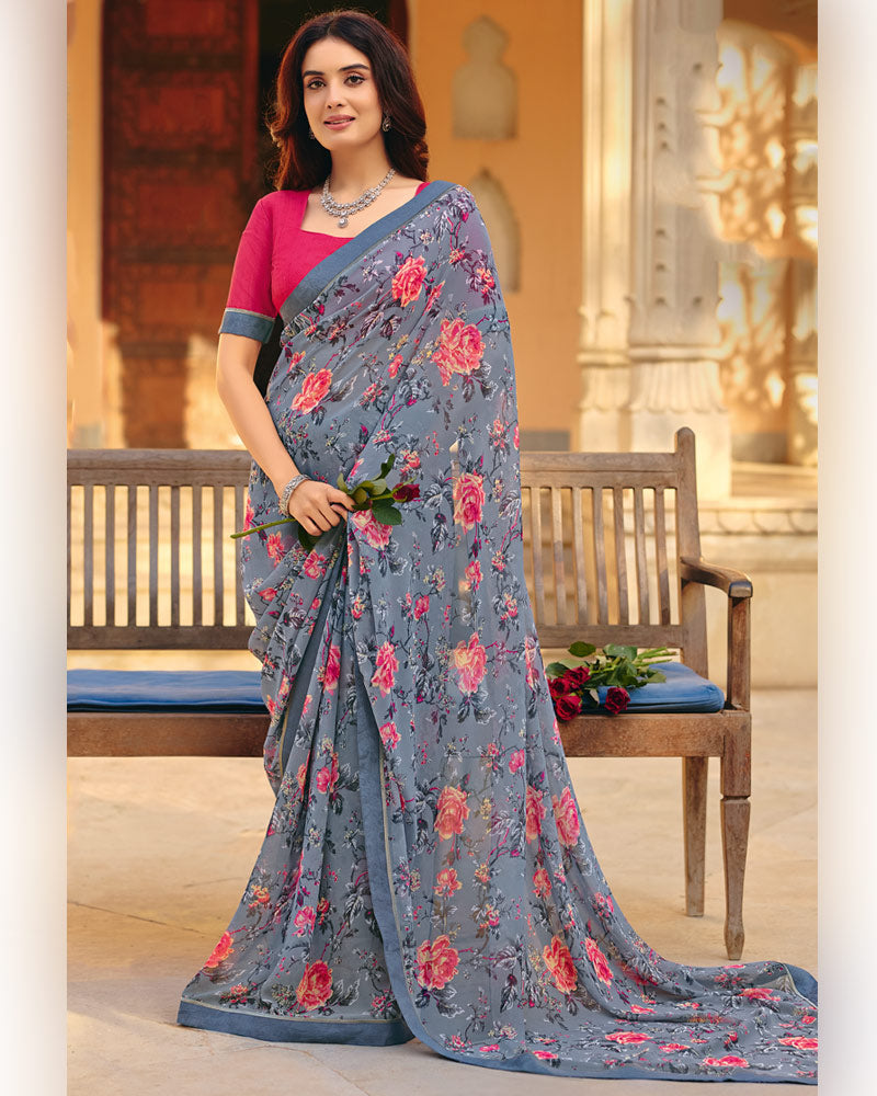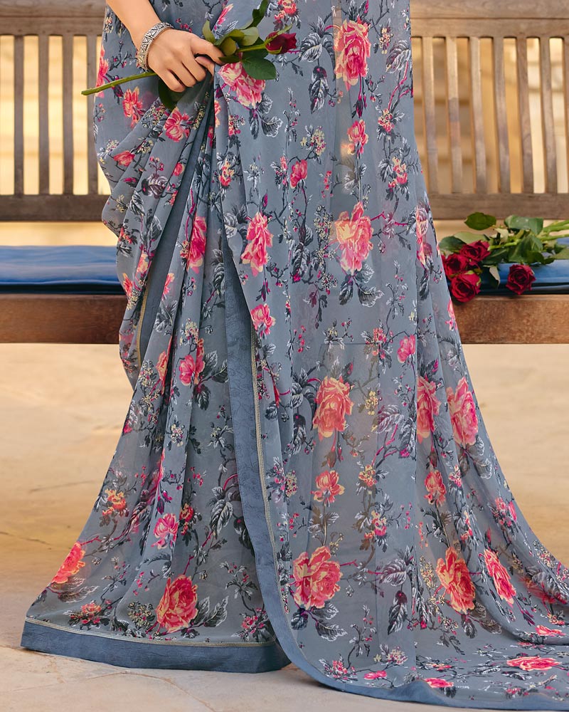 Vishal Prints Storm Grey Printed Georgette Saree With Fancy Border