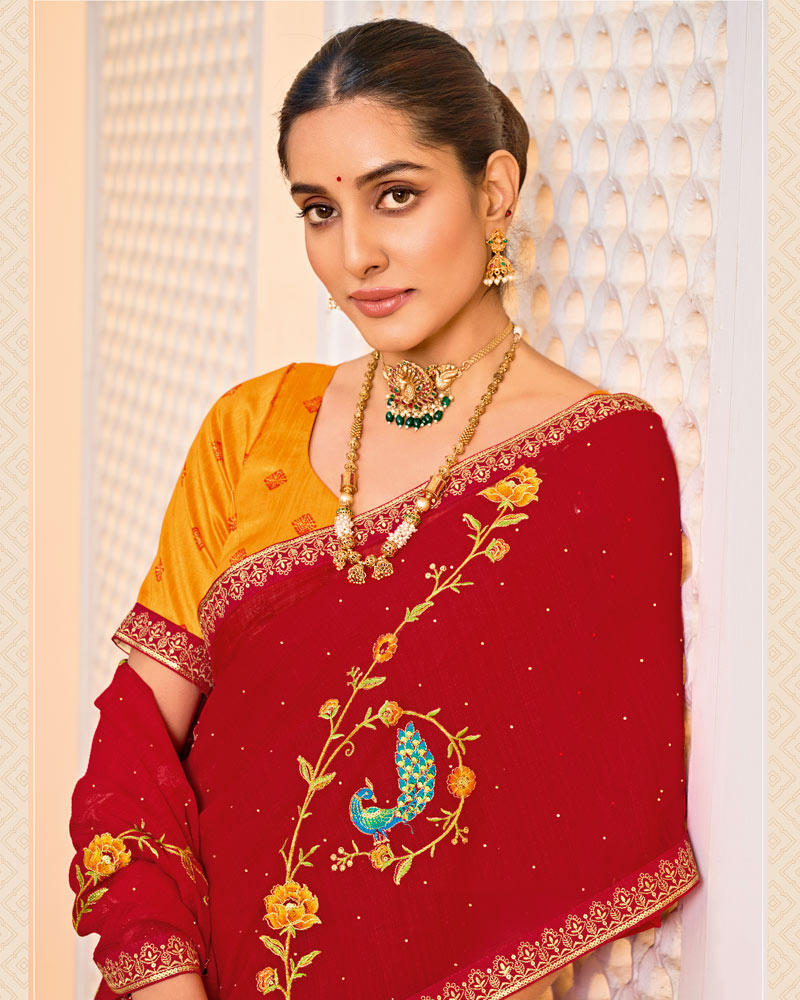 Vishal Prints Chili Red Designer Fancy Chiffon Saree With Embroidery-Diamond Work And Border