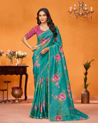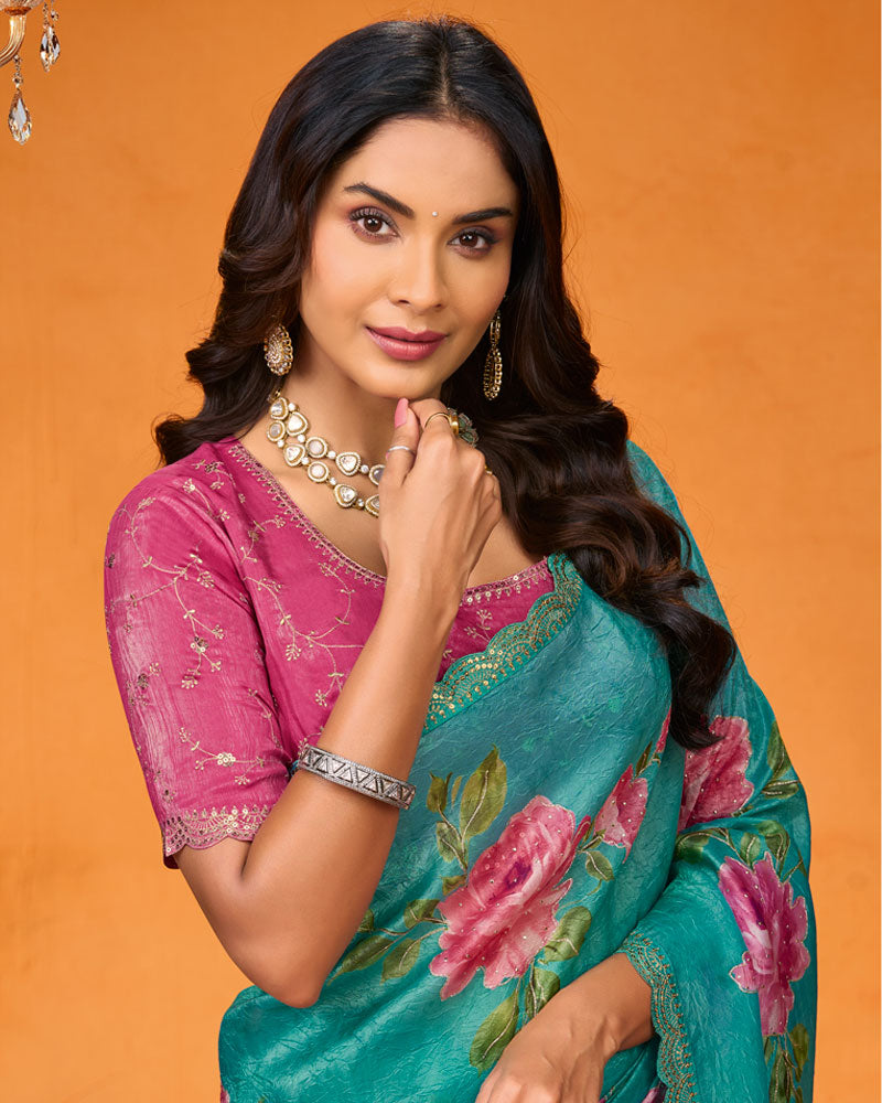 Vishal Prints Teal Green Designer Chiffon Saree With Foil Print-Diamond Work And Cut Work Embroidery Border