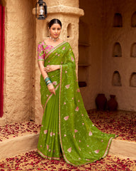 Vishal Prints Olive Green Designer Fancy Chiffon Saree With Embroidery-Diamond Work And Border