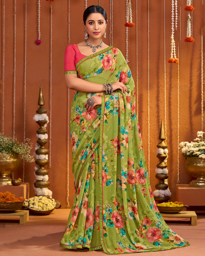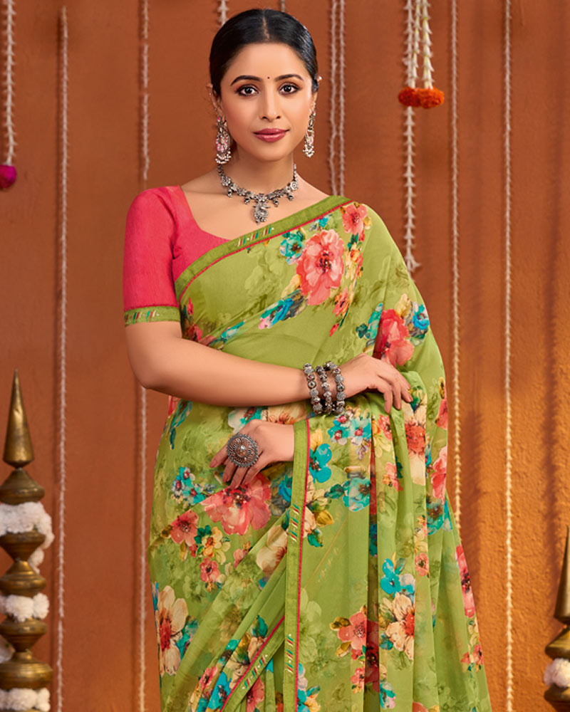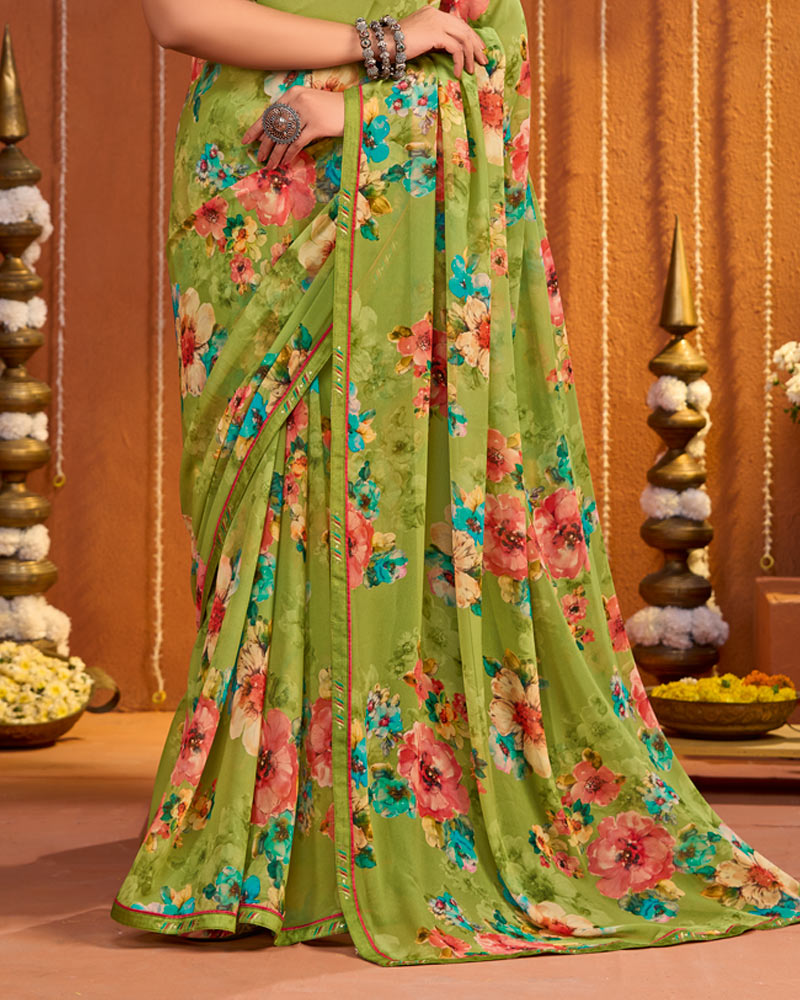 Vishal Prints Olive Green Digital Print Georgette Saree With Fancy Border