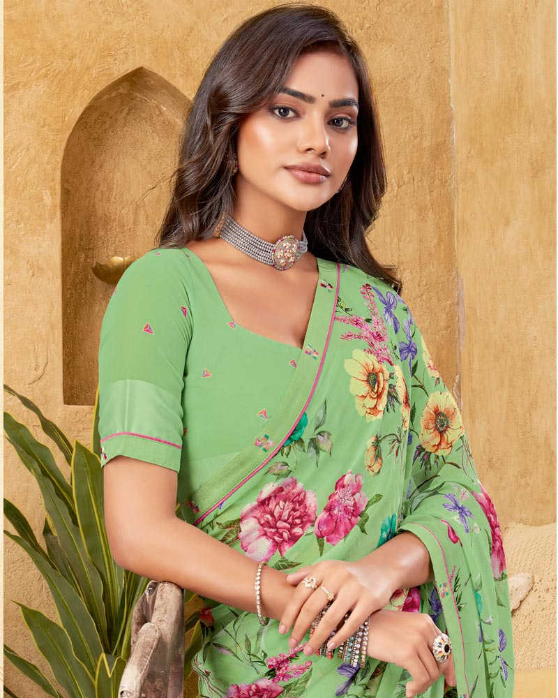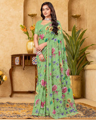 Vishal Prints Pistachio Green Printed Patterned Georgette Digital Print Saree With Fancy Border